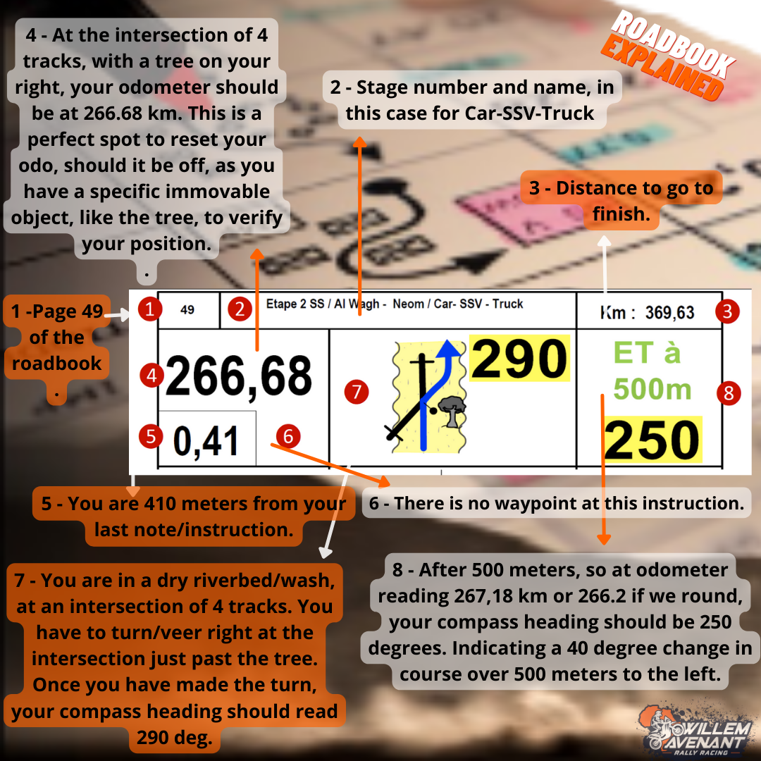 Roadbook Content: It includes distances, directions, angles, potential dangers, waypoints, and other course-related information.