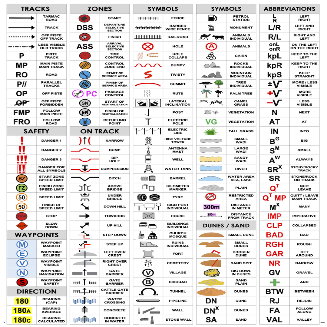 Lexicons and Symbols: Learning the meaning of various symbols and abbreviations used in roadbooks, such as danger indications, speed zones, compass headings, and waypoints.